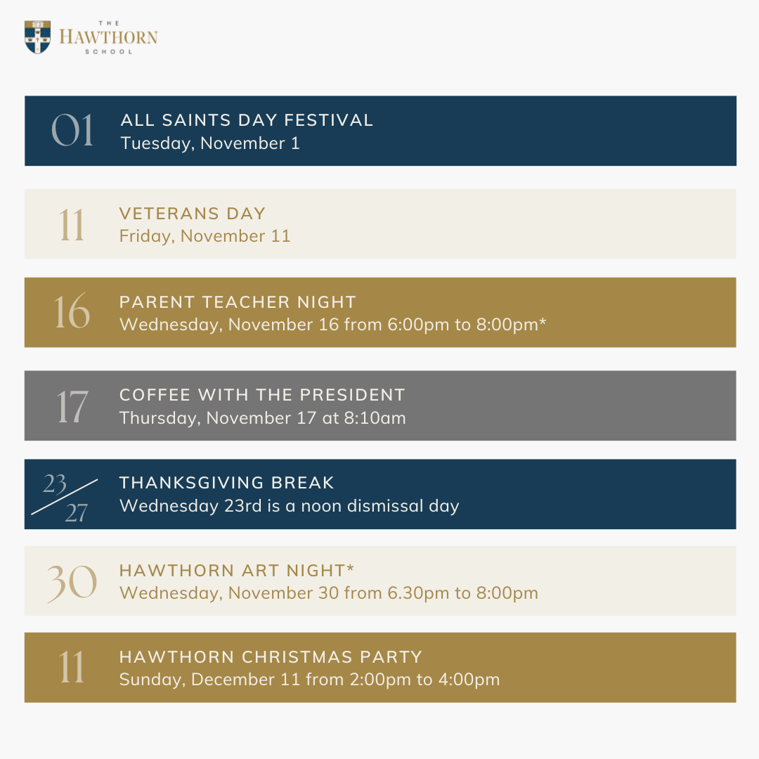 11/30 Hawthorn Art Night*, 6:30pm to 8:00pm. Join us on Wednesday 30th for a parent evening. We will have an art tour while enjoying some refreshments and getting to know other parents. Friends are welcome. RSVP here.
